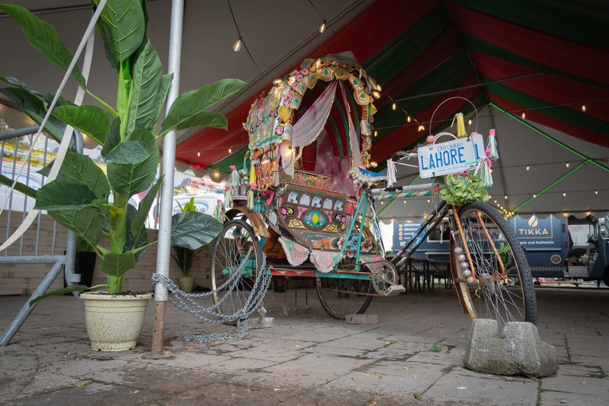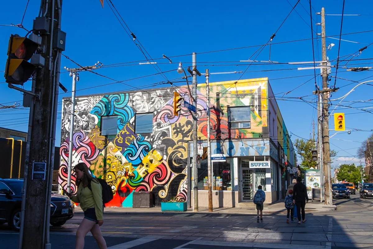 It’s morning in Little India in Toronto’s east end. This mural, completed by mural artists Flips and Rowell Soller in 2024 at the neighbourhood’s main intersection of Coxwell Ave and Gerrard St, compliments the colourful area.